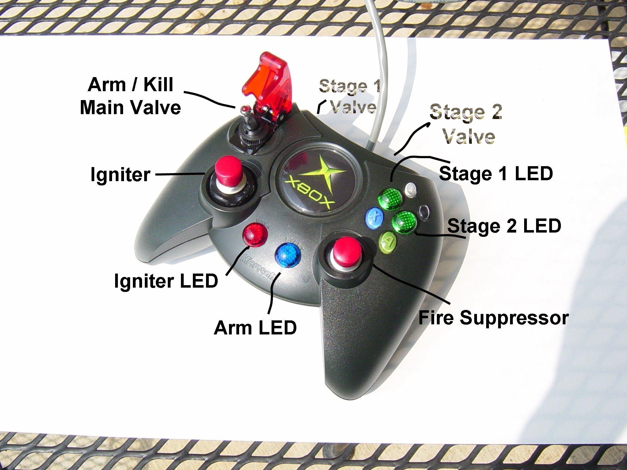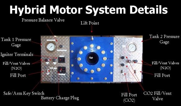 System controls, fill ports, igniter terminals, vent valves and pressure gauges are positioned on the rear of the rocket motor enclosure.